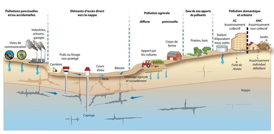 L'eau est fréquemment polluée. Identifier les différentes sources de pollution sur cette illustration